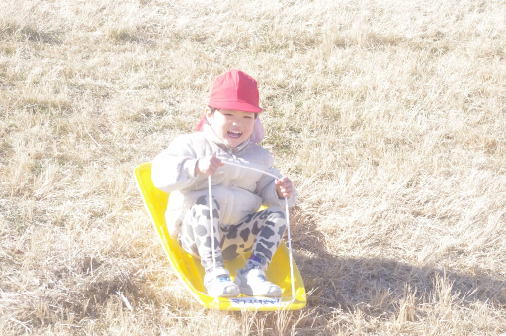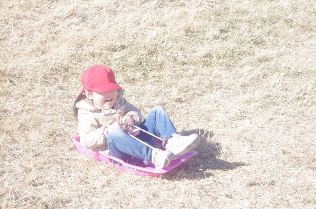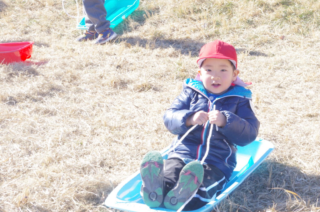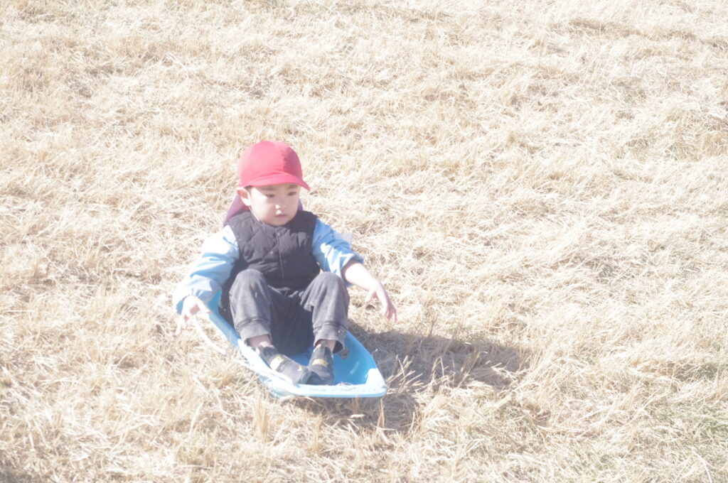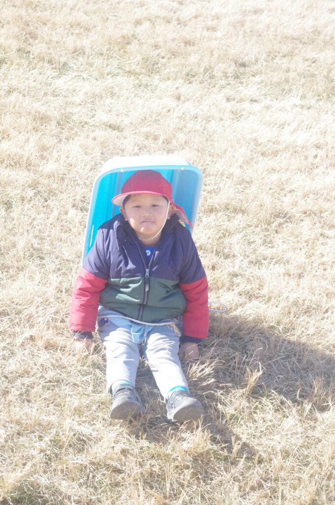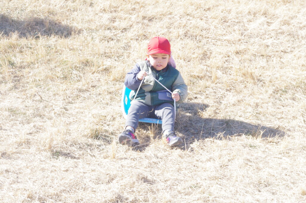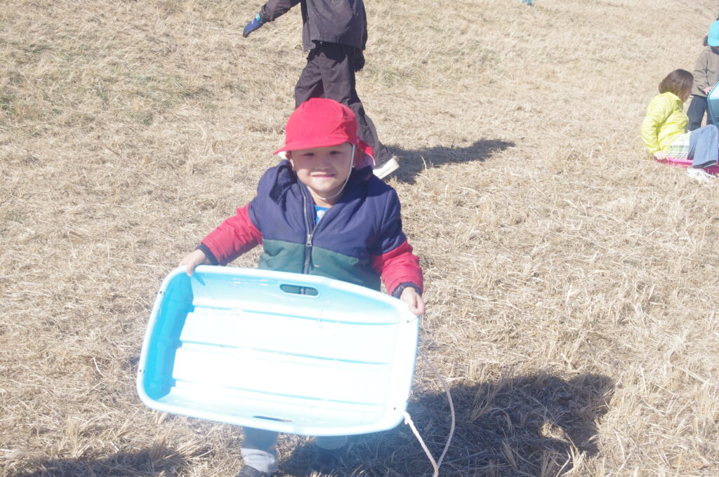 初めてのそり遊びに夢中になって、何度も滑り降りては登ってを繰り返し。