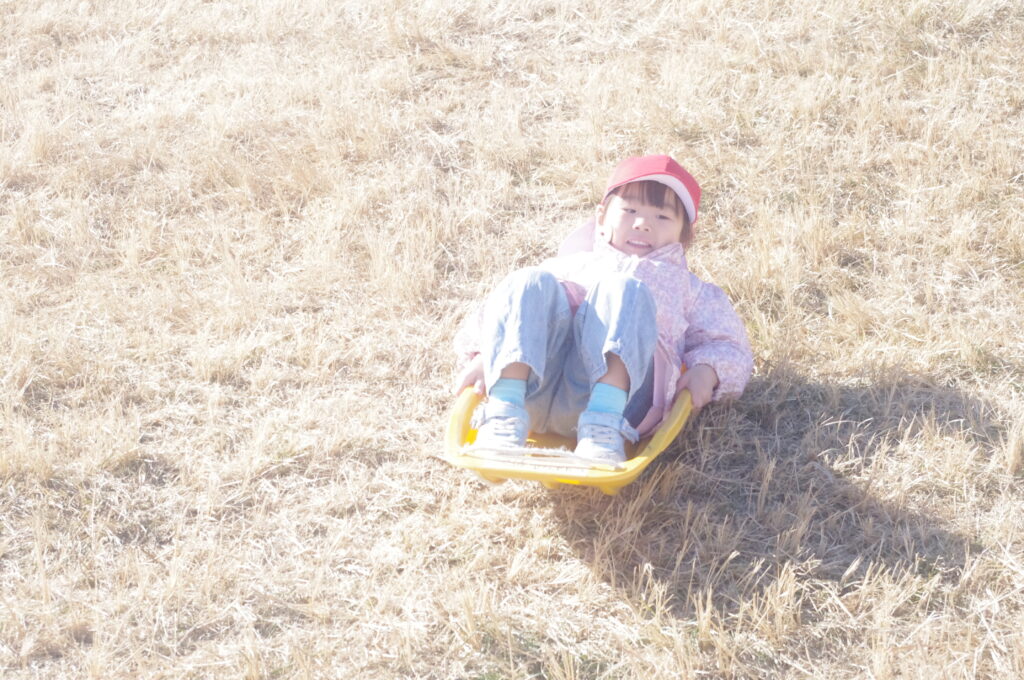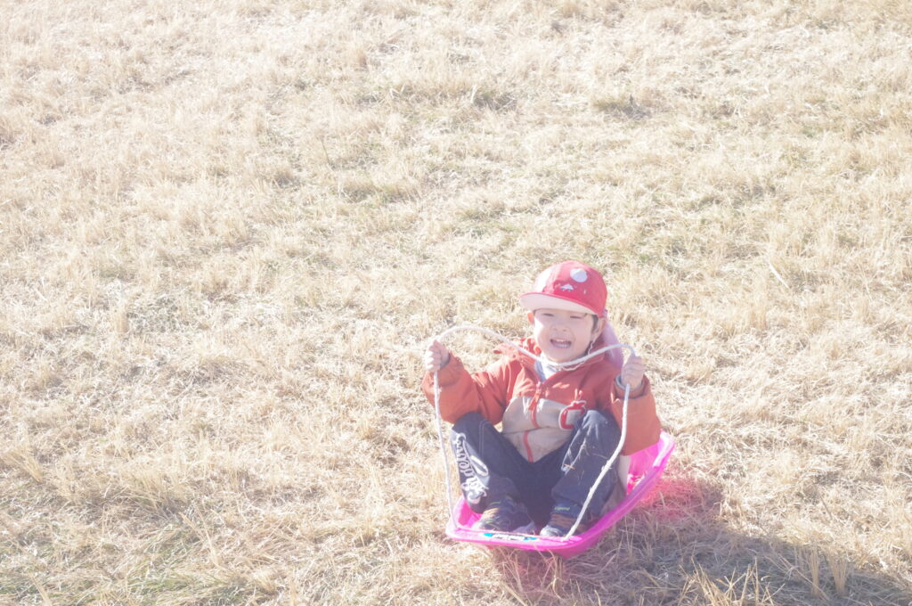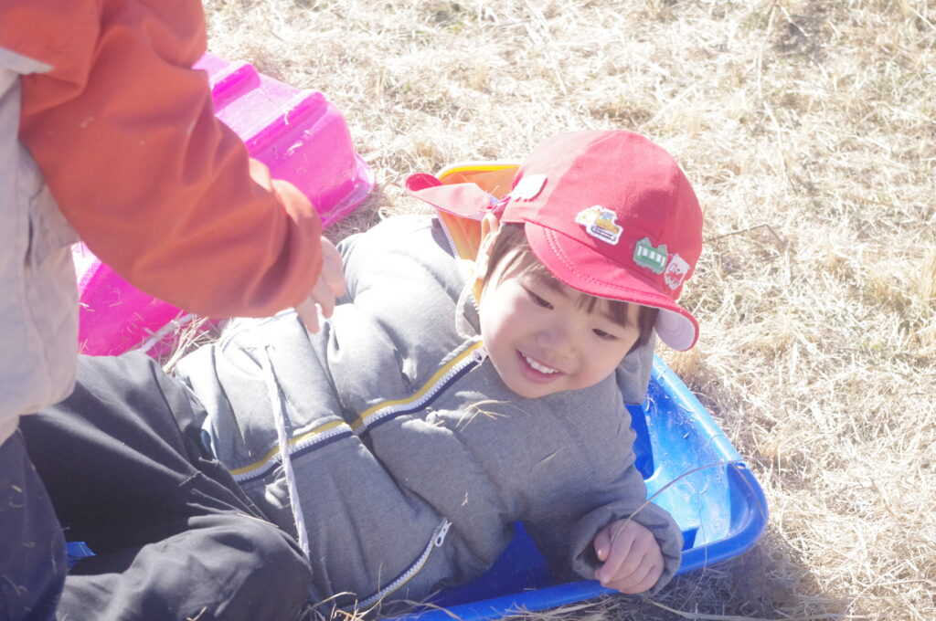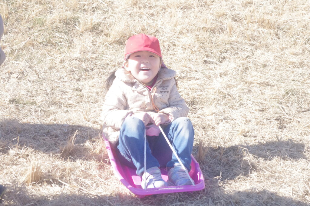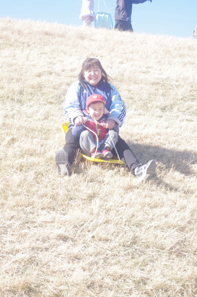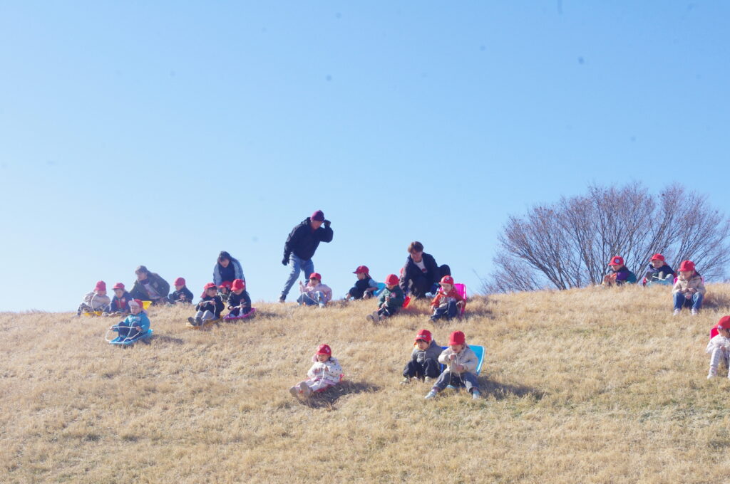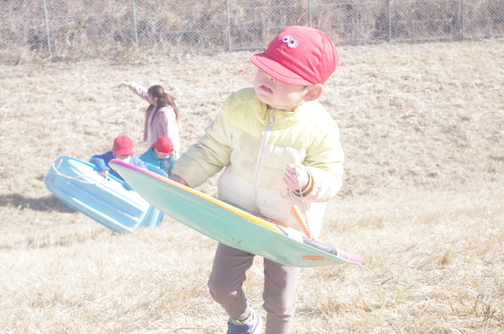 初めてのそり遊びに夢中になって、何度も滑り降りては登ってを繰り返し。