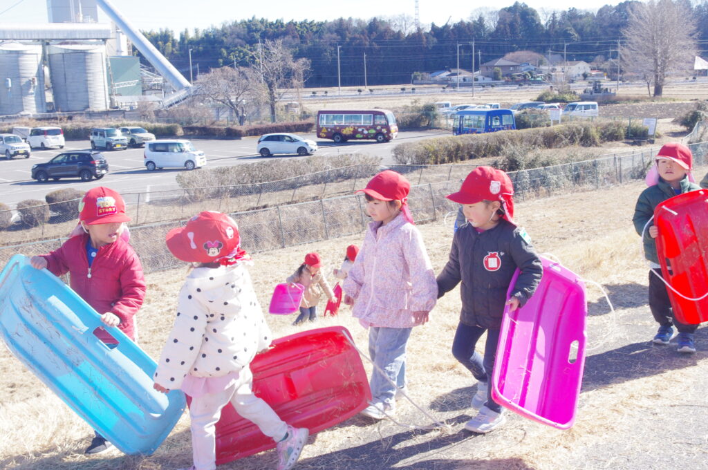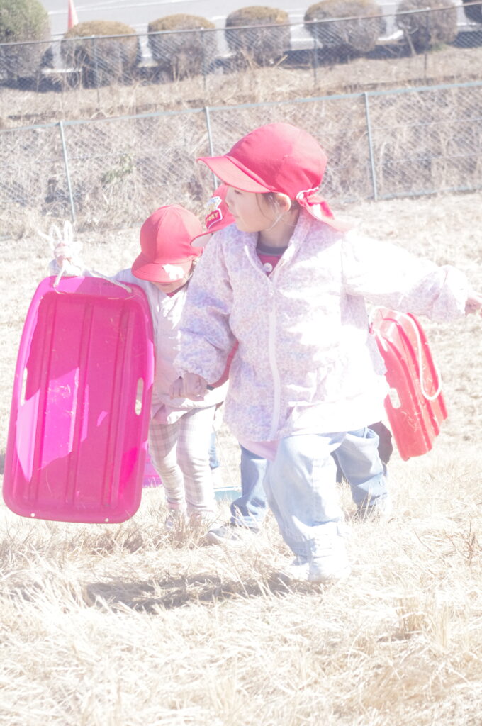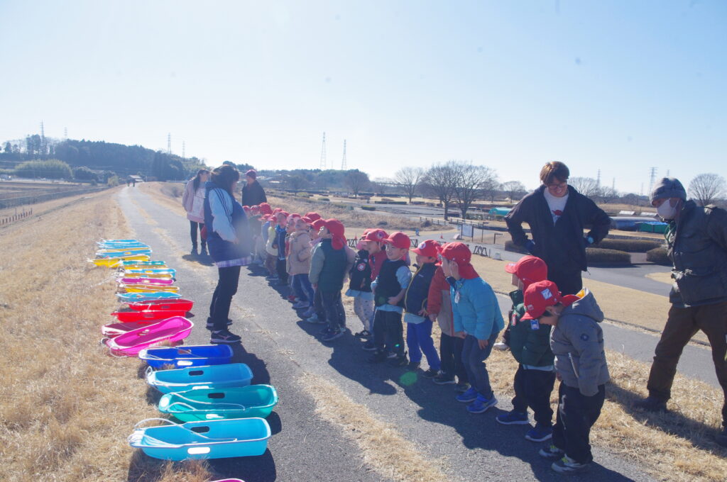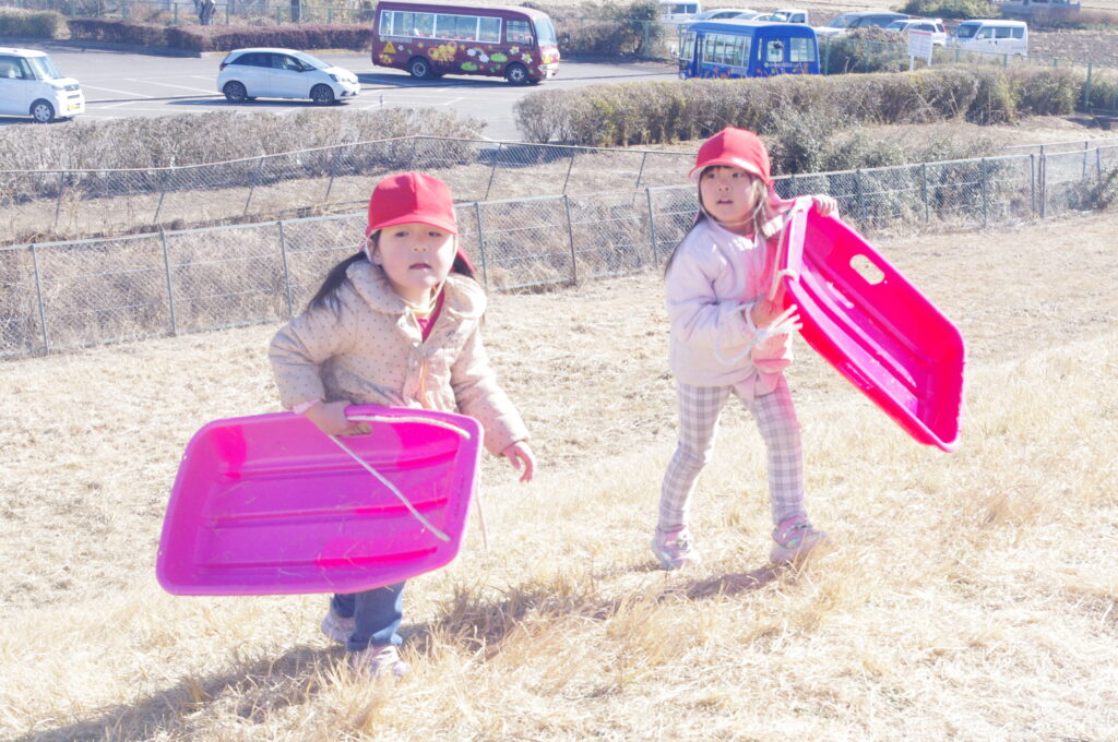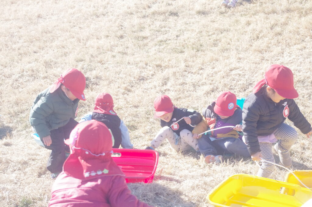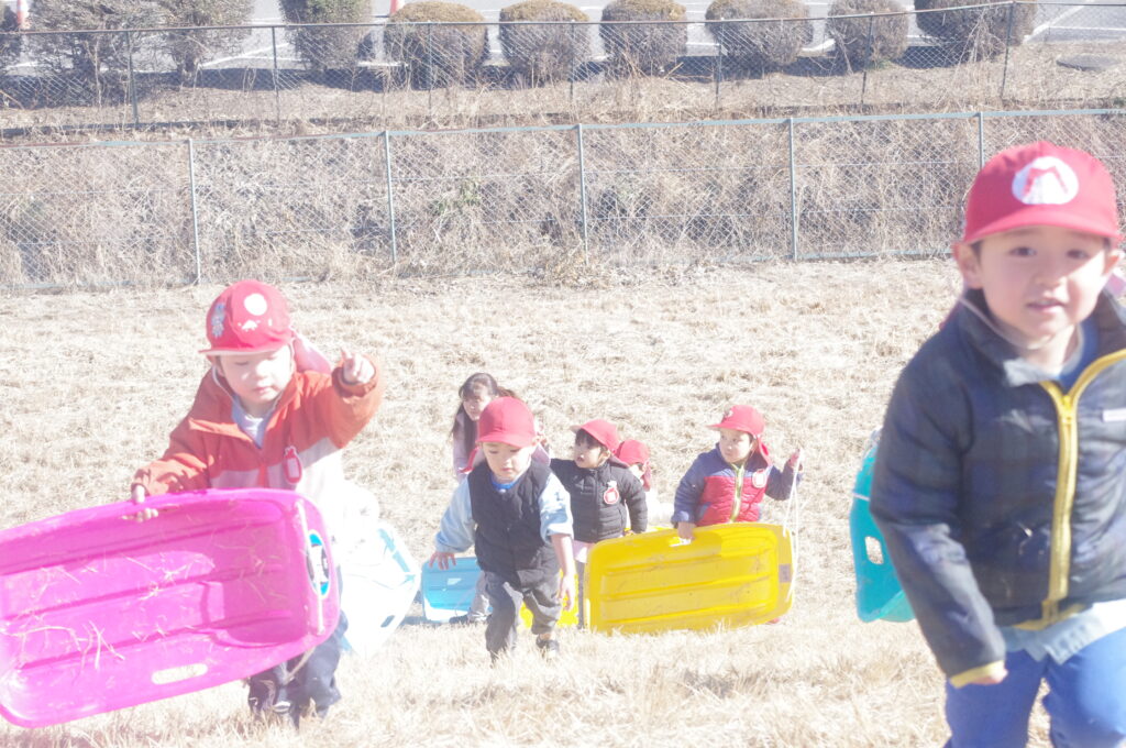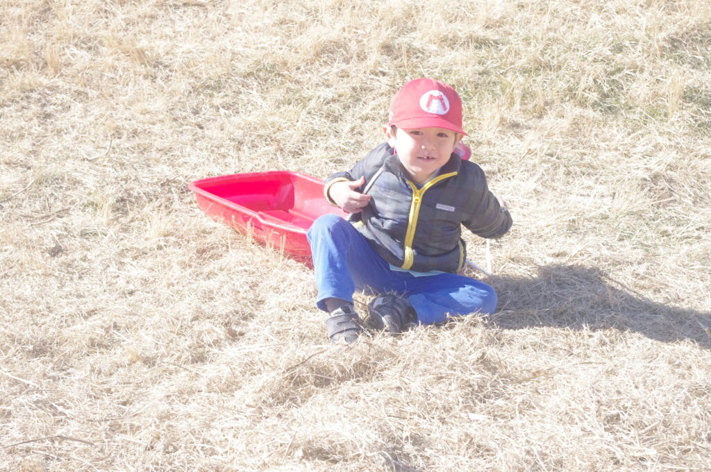 初めてのそり遊びに夢中になって、何度も滑り降りては登ってを繰り返し。