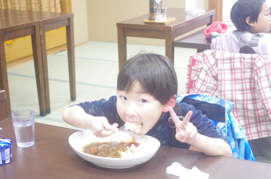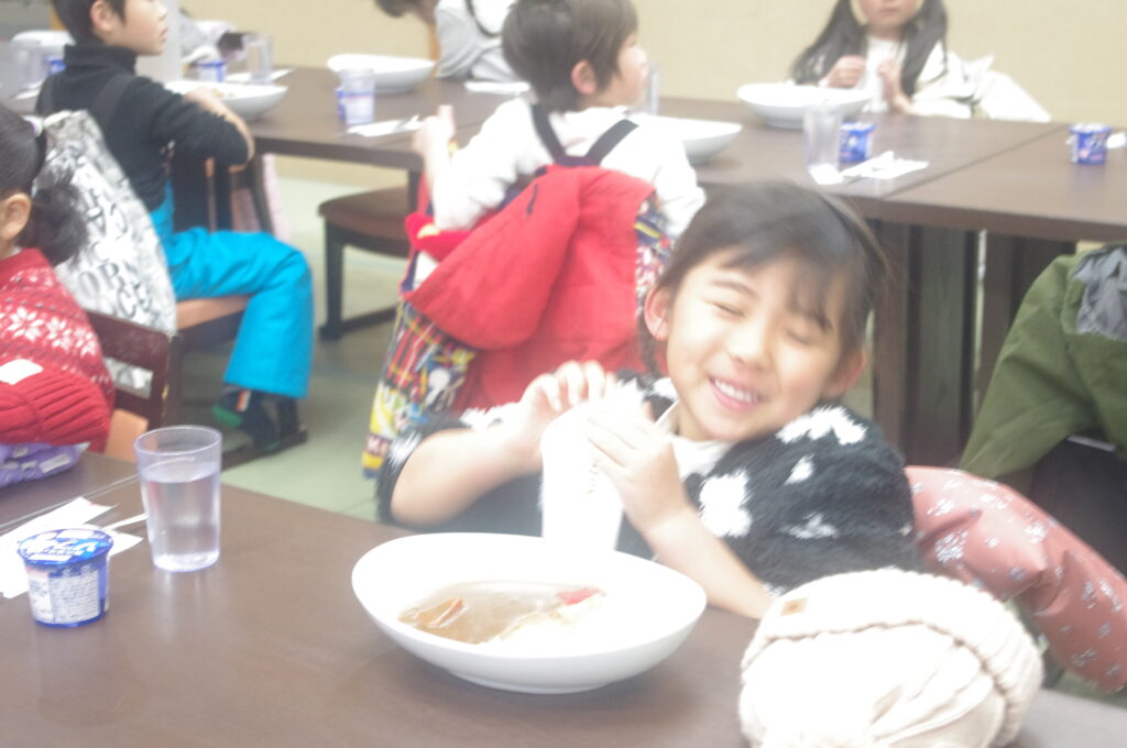 雪山で身体を動かした後のカレーライスは格別な美味しさ。
