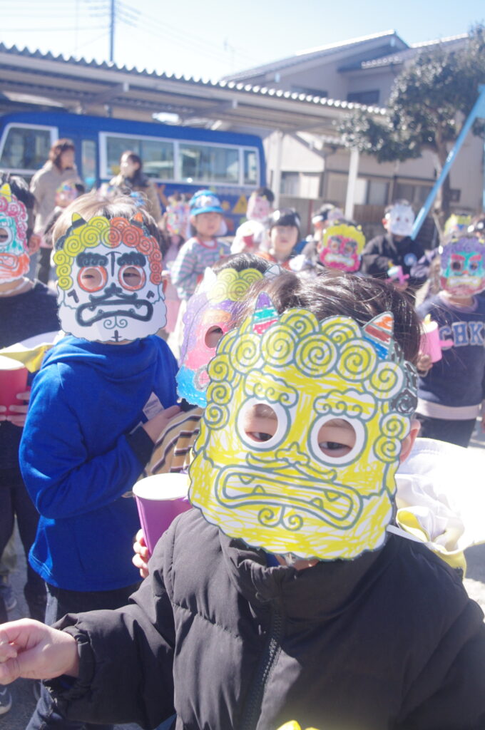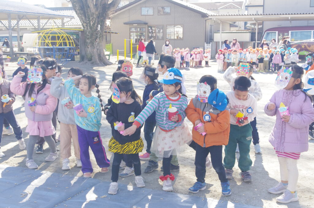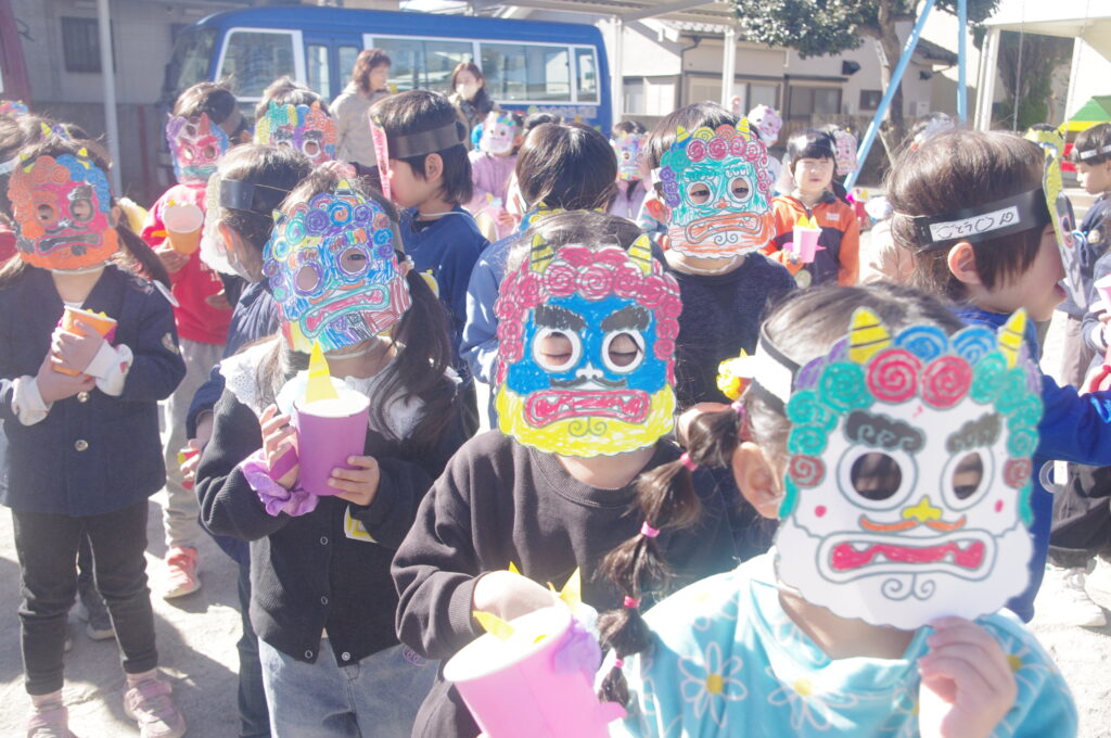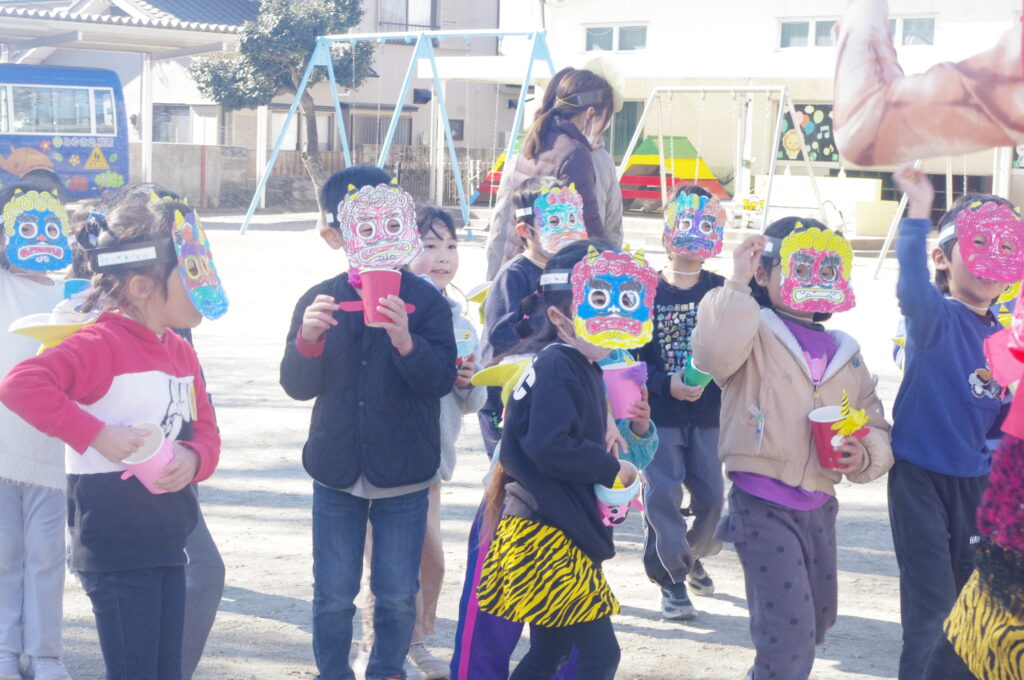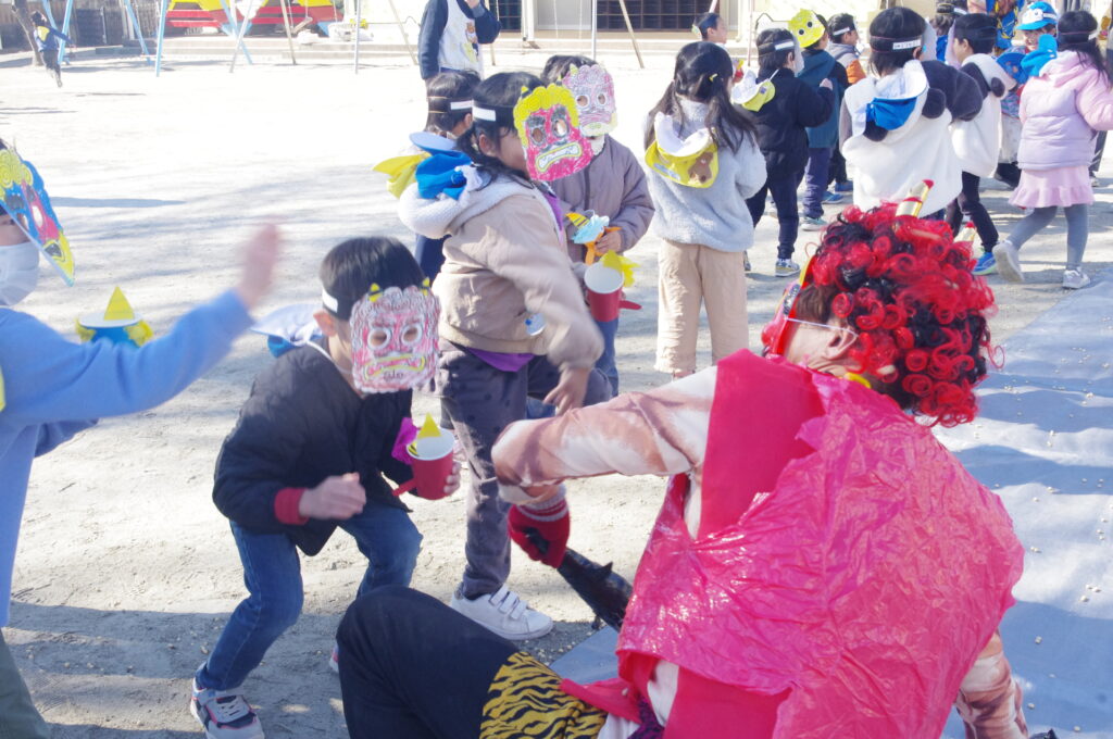 自分たちで作った豆入れや鬼のお面で園庭に現れた赤鬼青鬼を「おにはー外!!」の元気なかけごえで無事退治。