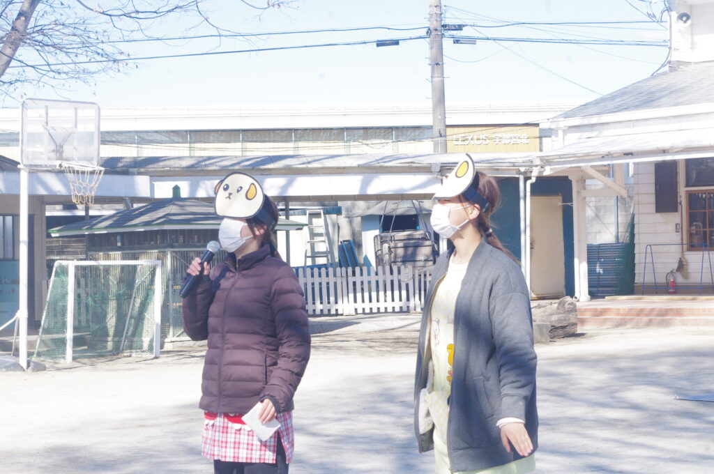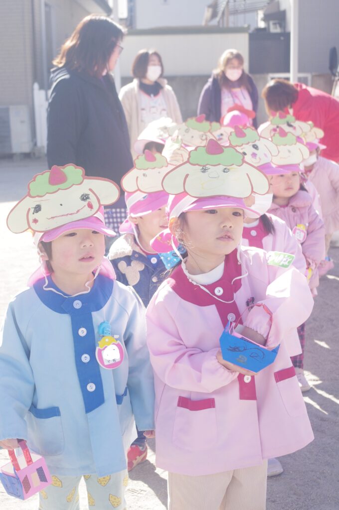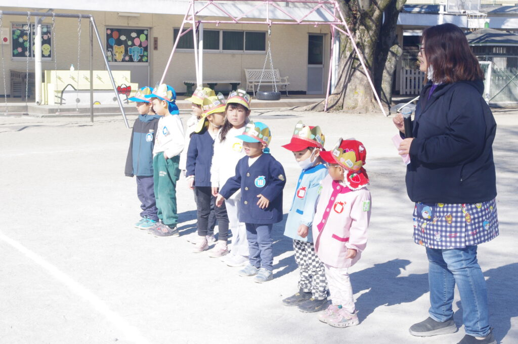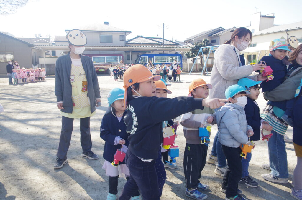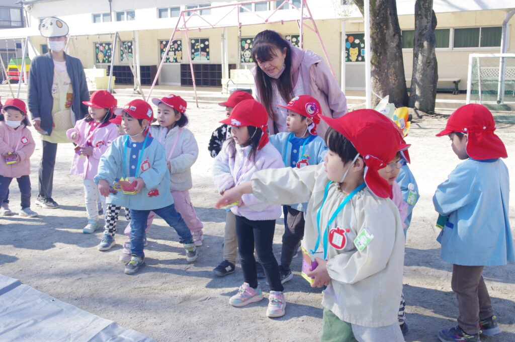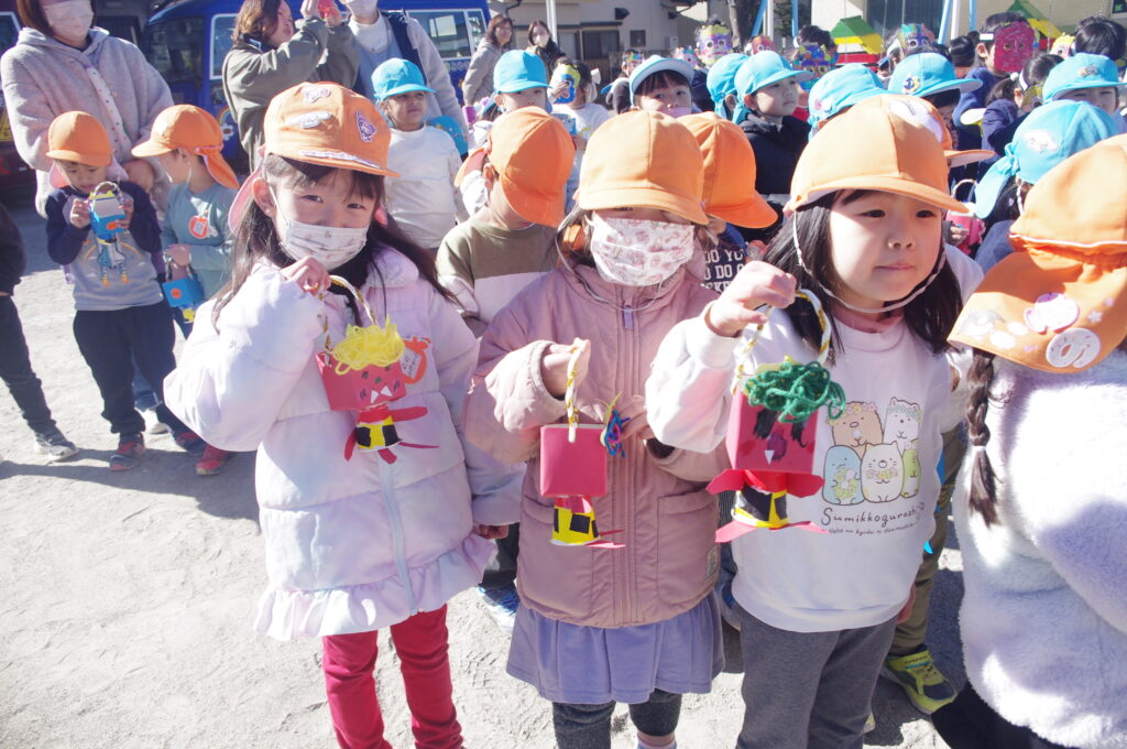 自分たちで作った豆入れや鬼のお面で園庭に現れた赤鬼青鬼を「おにはー外!!」の元気なかけごえで無事退治。
