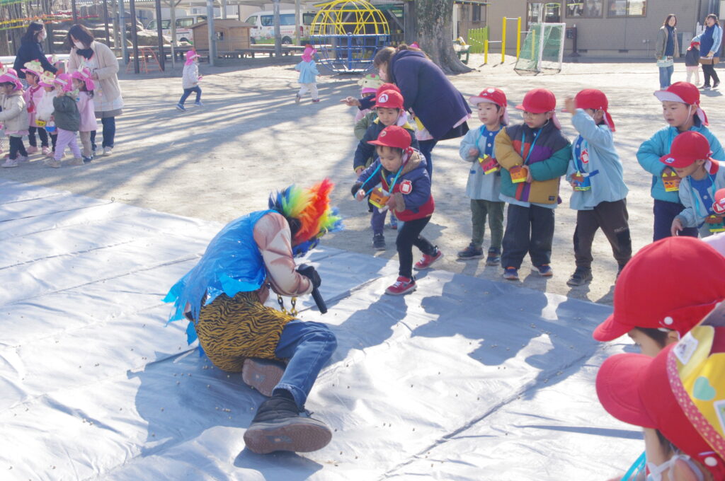 満3歳児クラスや年少組も誰一人泣いたり怖がることなく、勇気を出して元気に豆を投げてつけていました。