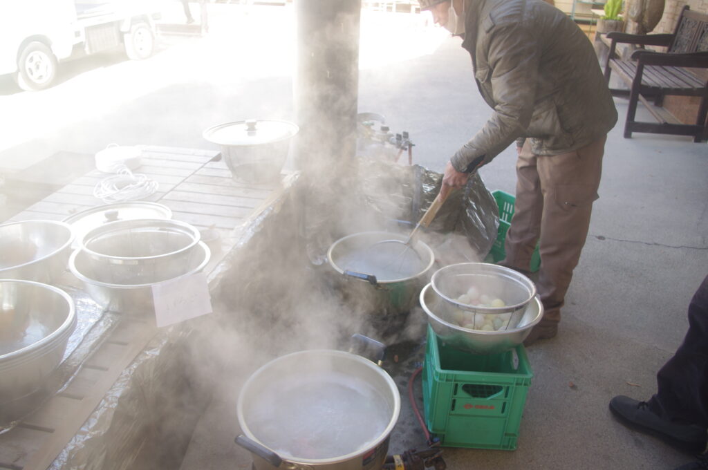 明日のどんど焼きに備えて、今日はみんなでまゆ玉作り。