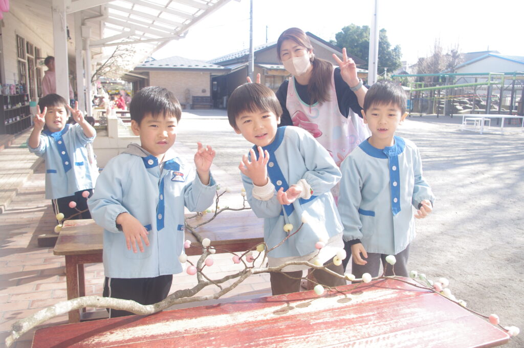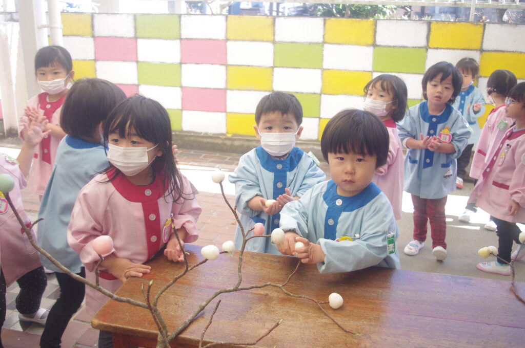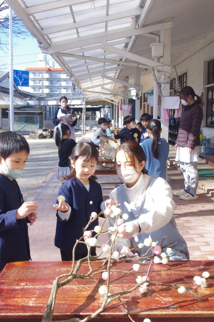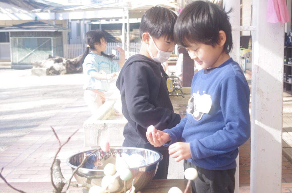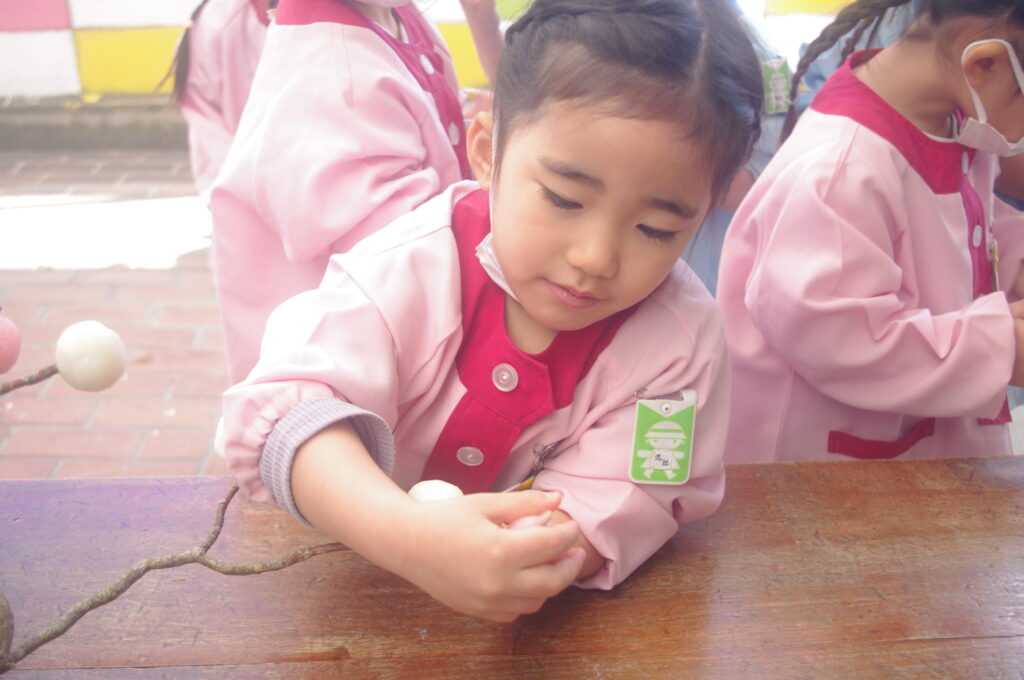 みずきの枝に、蒸した色とりどりのお団子をつけていきました。