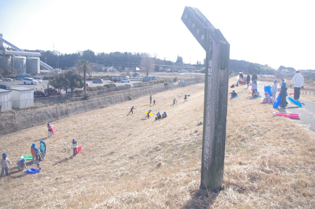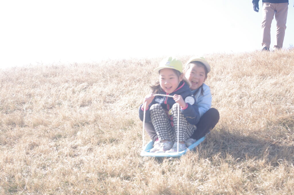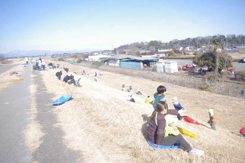 今日は年長組、鬼怒グリーンパークの河原で、芝スキーを楽しんできました。