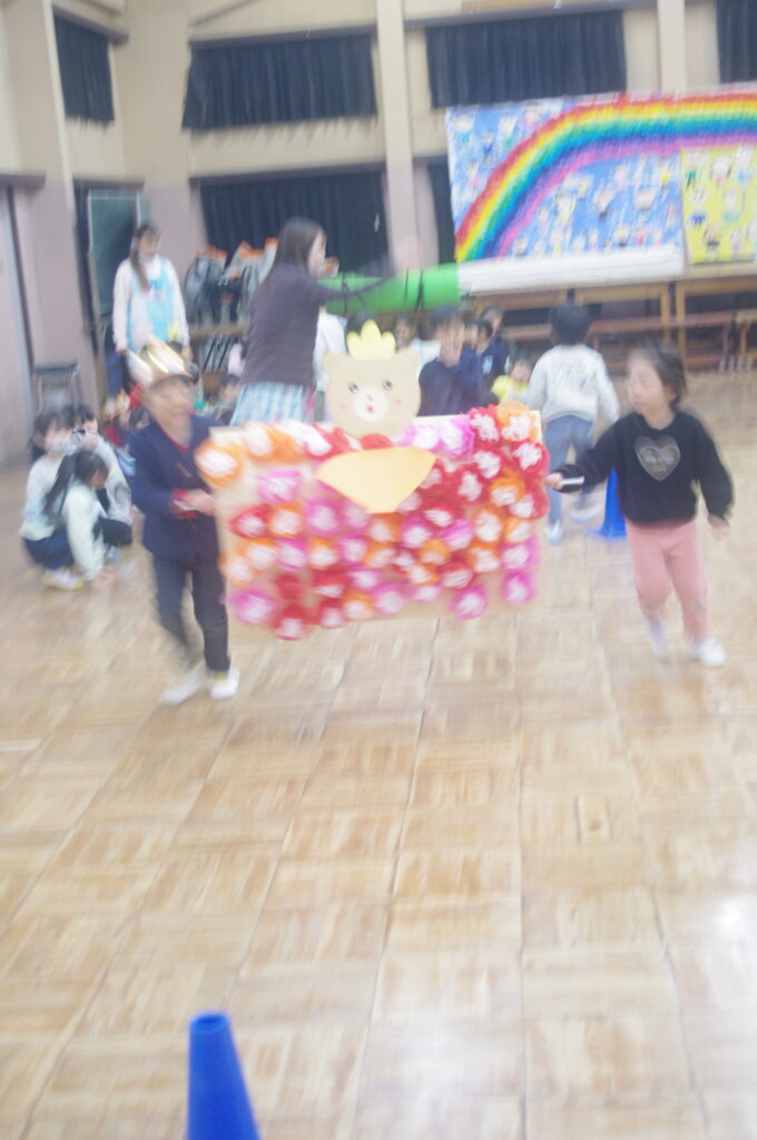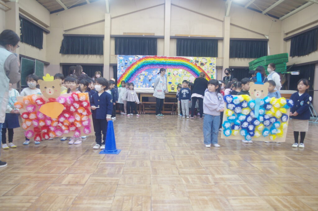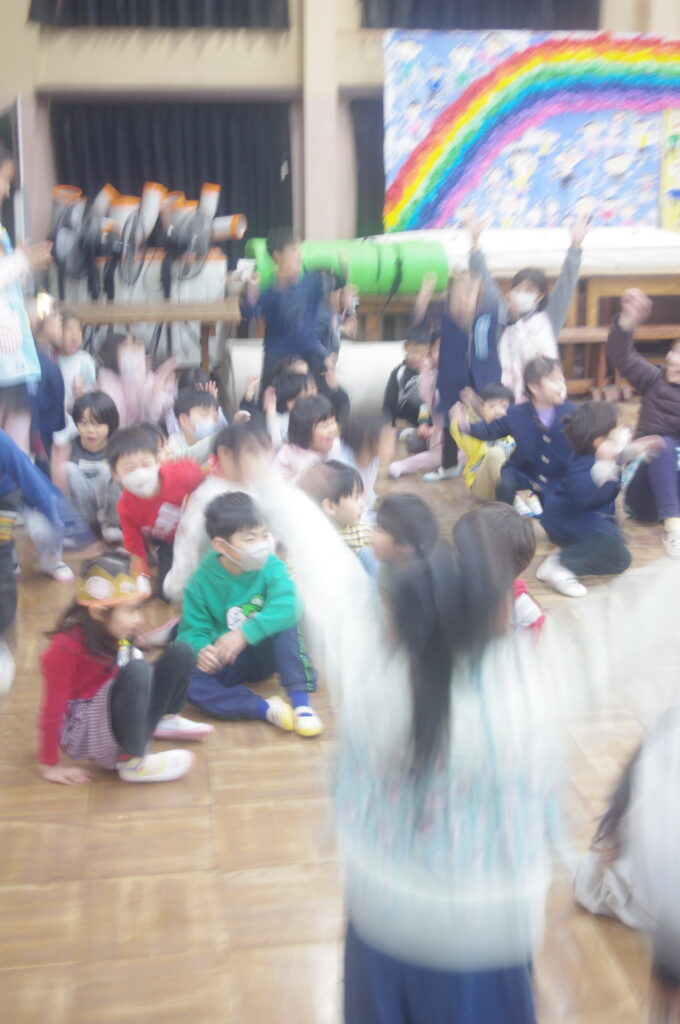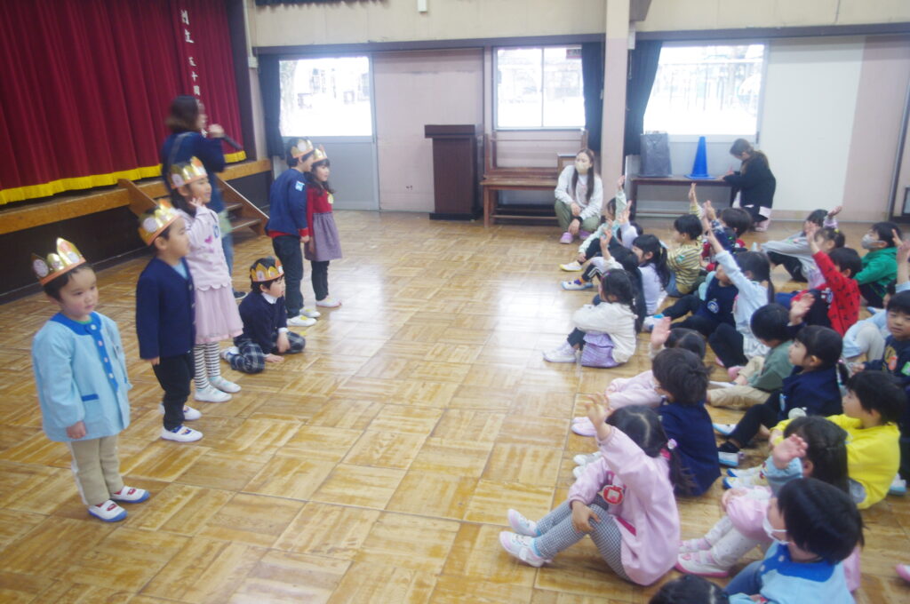 3月にしてはとても寒い日になりましたが、体育館で子どもたちは楽しく身体を動かして、ゲームや歌に勤しんでいました。