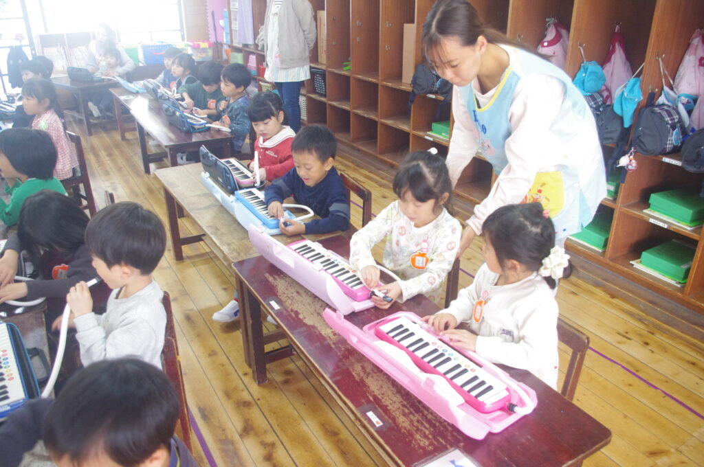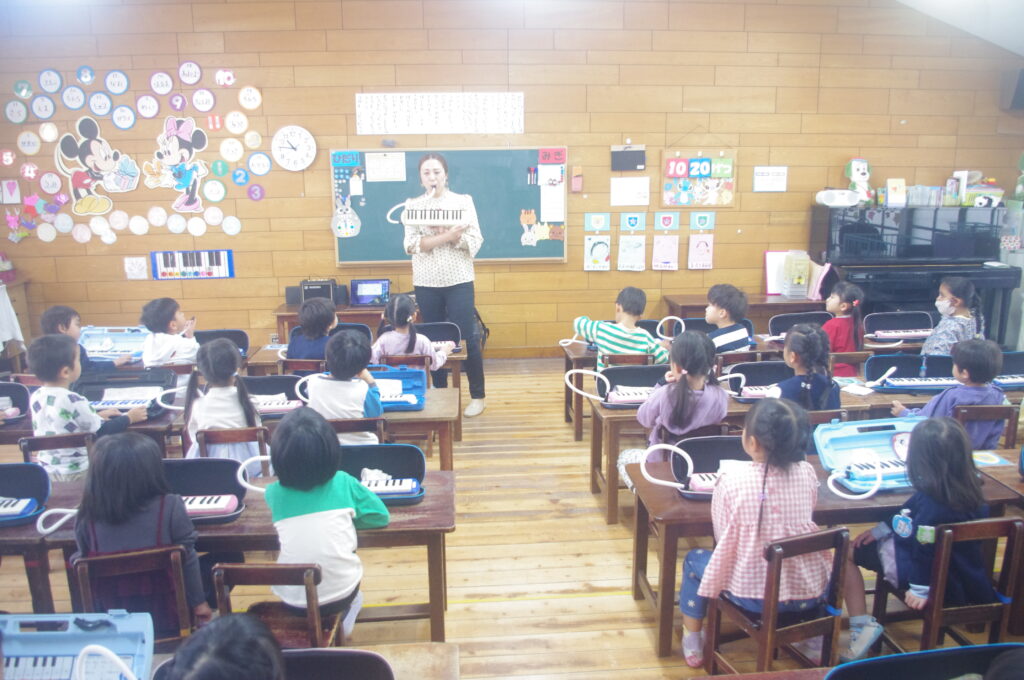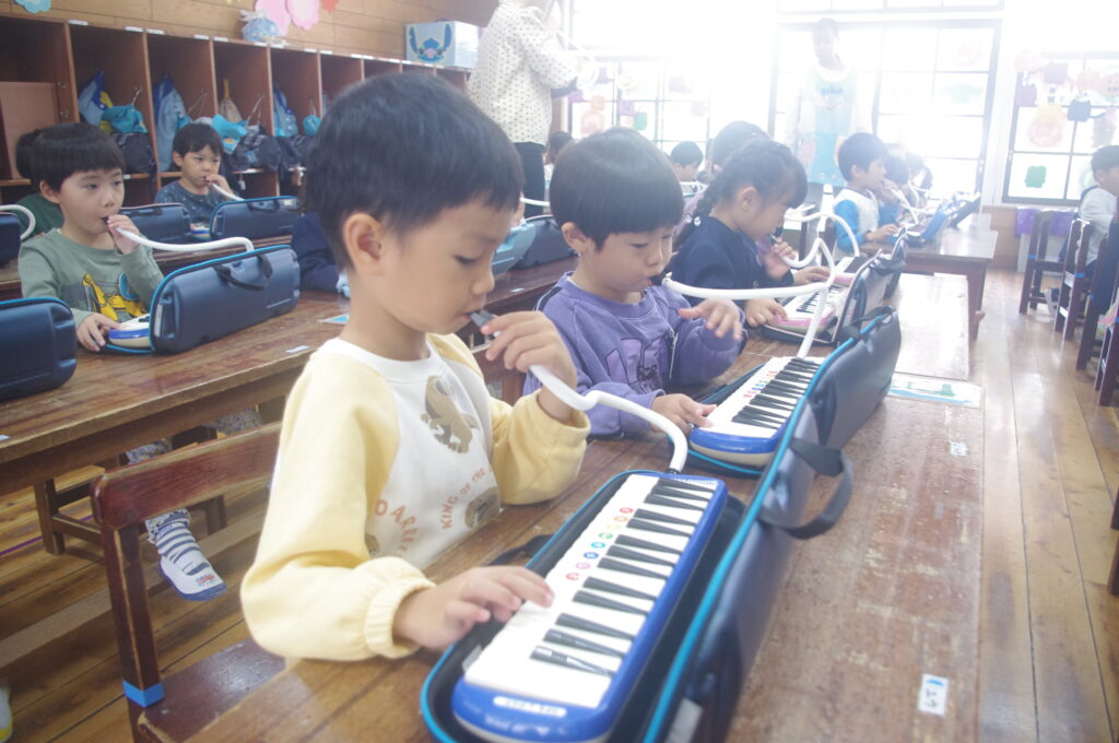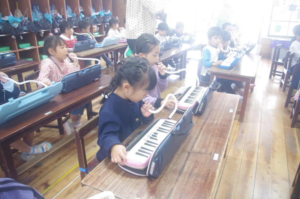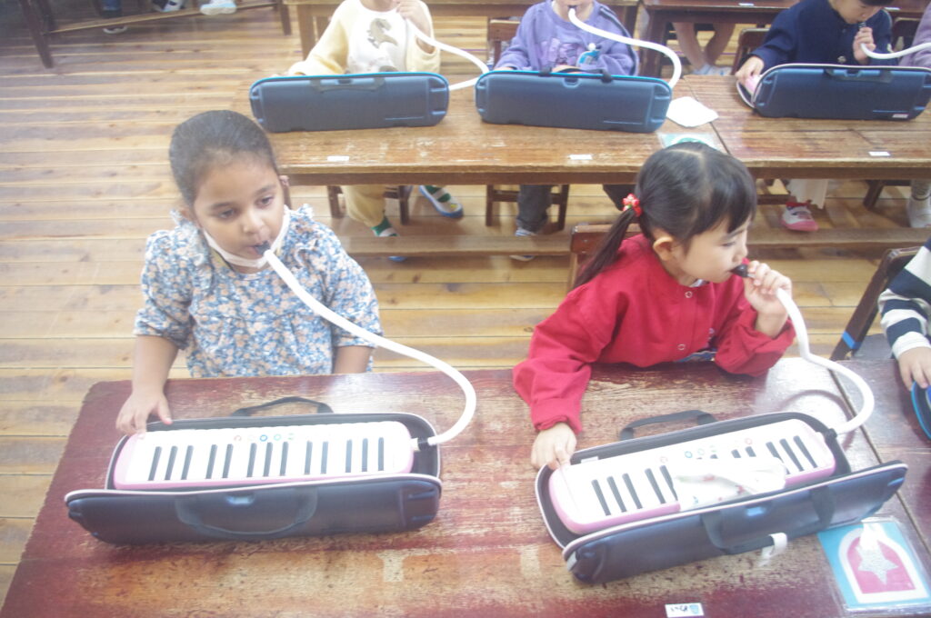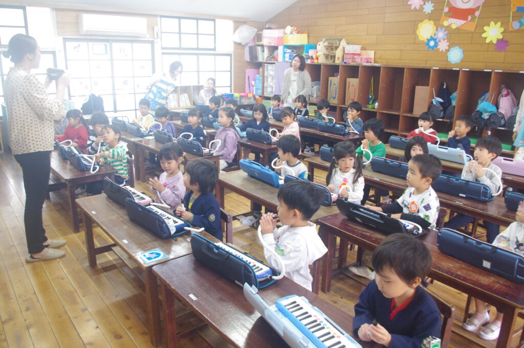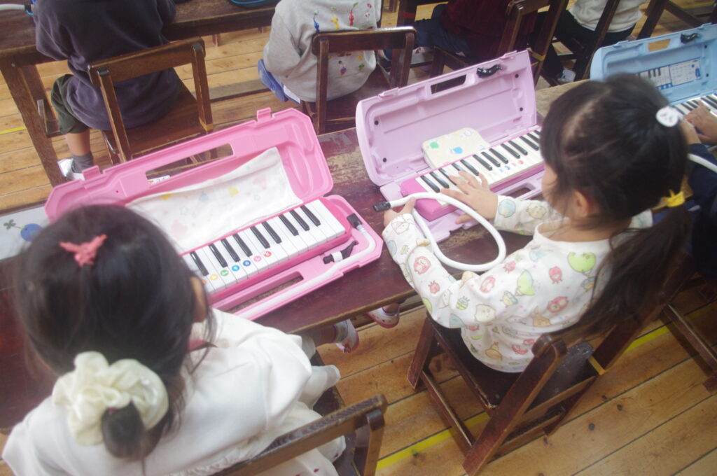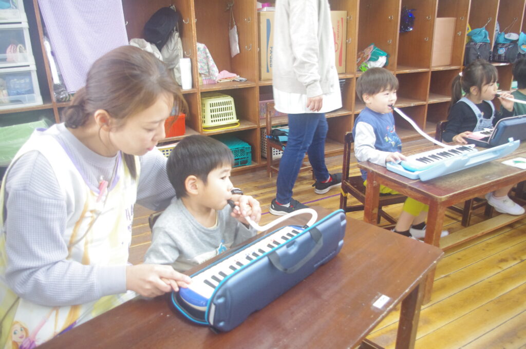今日は専門の講師の方をお招きして、年中組のメロディオン講習会。
