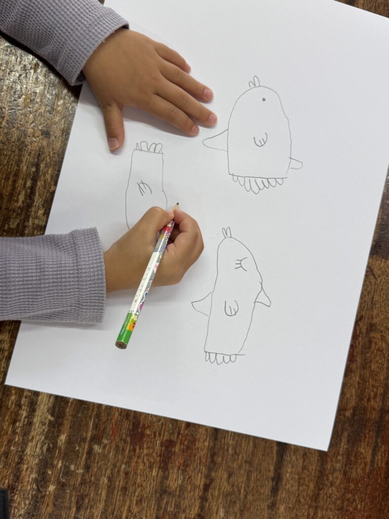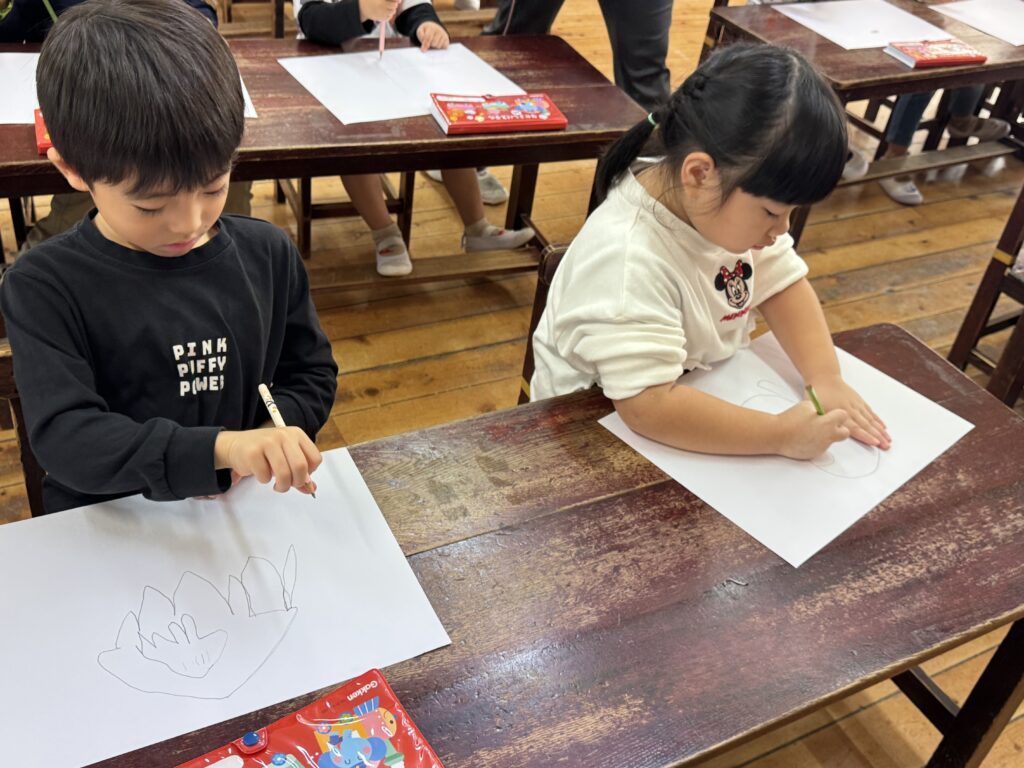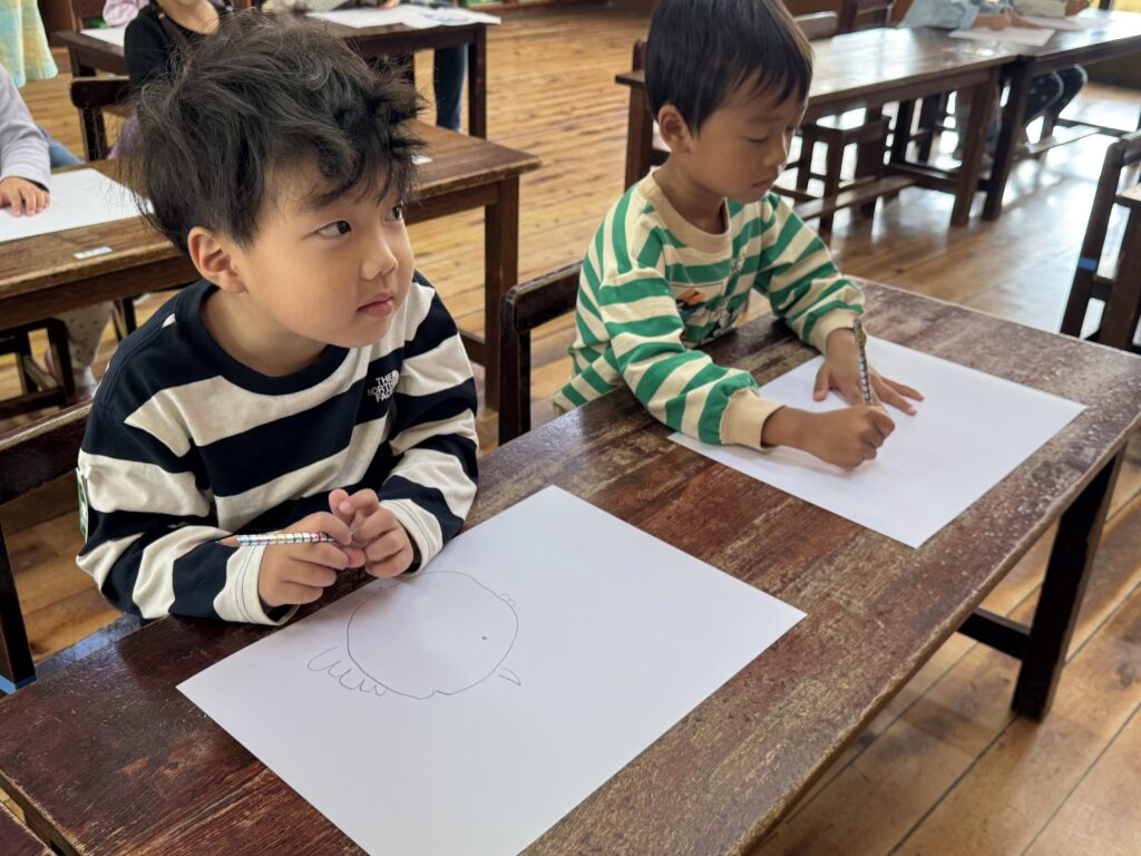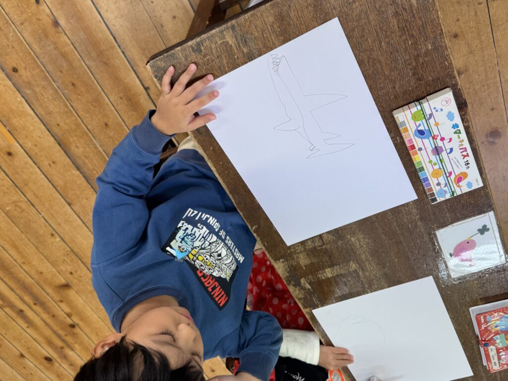 楽しかった思い出を思い起こしながら今日は子どもたちが印象に残った魚や海の動物たちの絵を。
