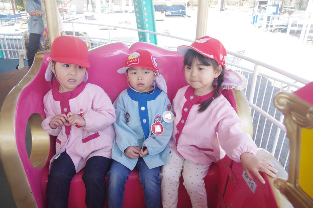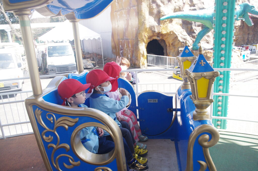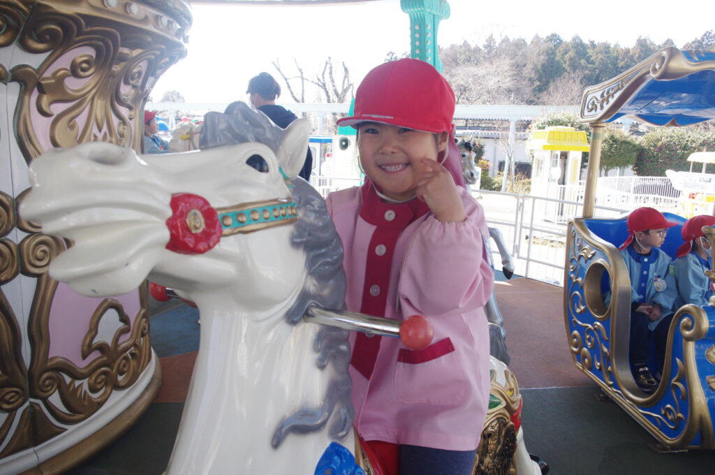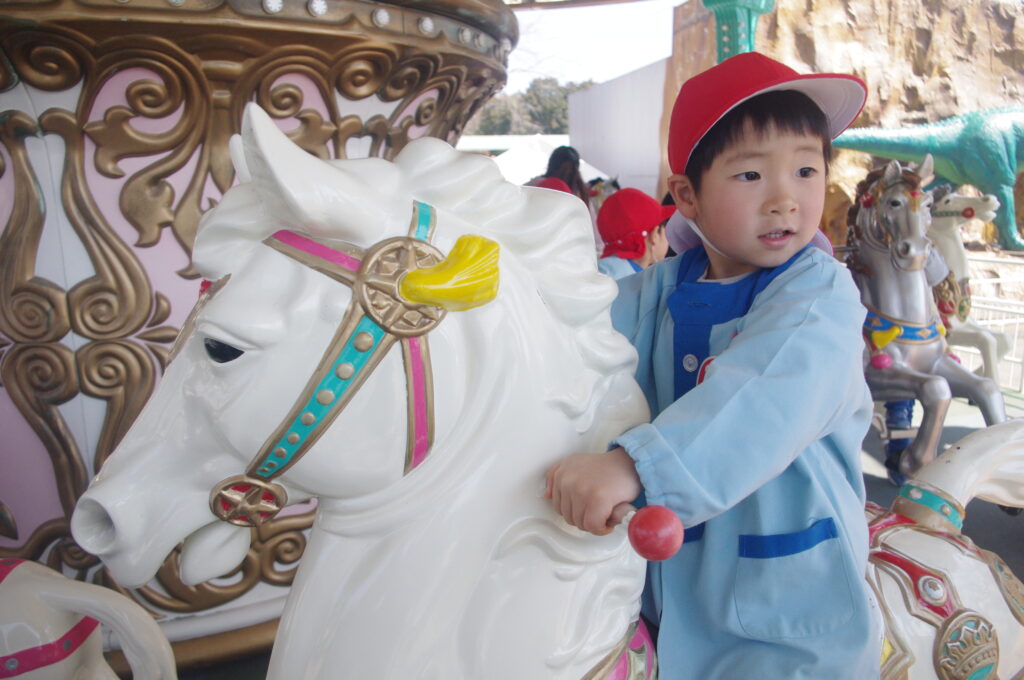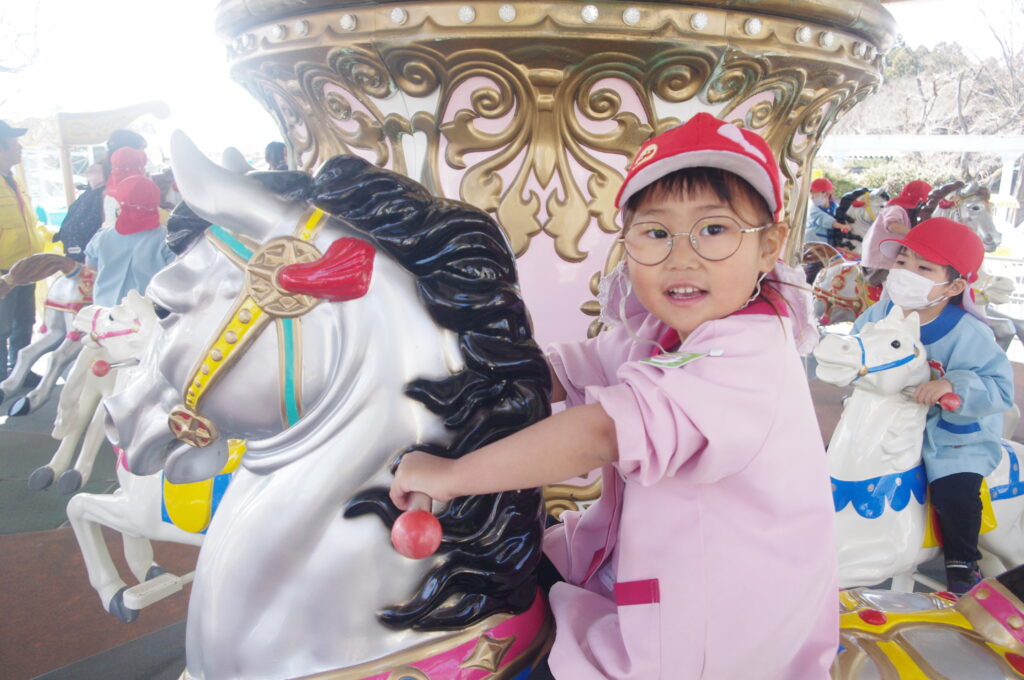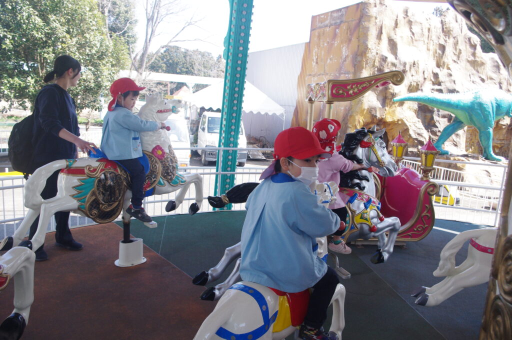 モルモットさんと触れ合いタイムの後は遊園地に移動して、みんなでメリーゴーランドに乗りました。